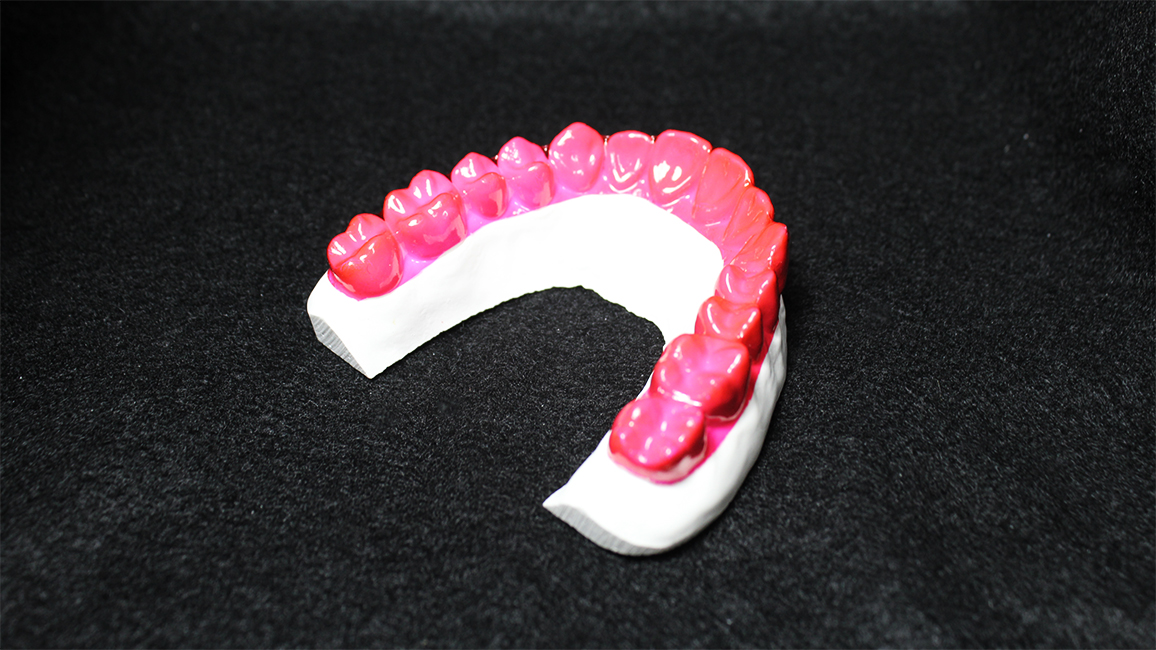 『ブラックスチェッカー』とは、上あごの歯に装着する薄いマウスピースのようなもので、 睡眠時にブラキシズムを起こしている部分が削れて色がとれることで歯ぎしりのパターンがわかる簡易検査装置です。 その検査結果により噛み合わせを調整したりマウスピース等を作製し、歯や顎の負担を最小限に減らし歯の破壊を防いだり騒音防止にもなります。
